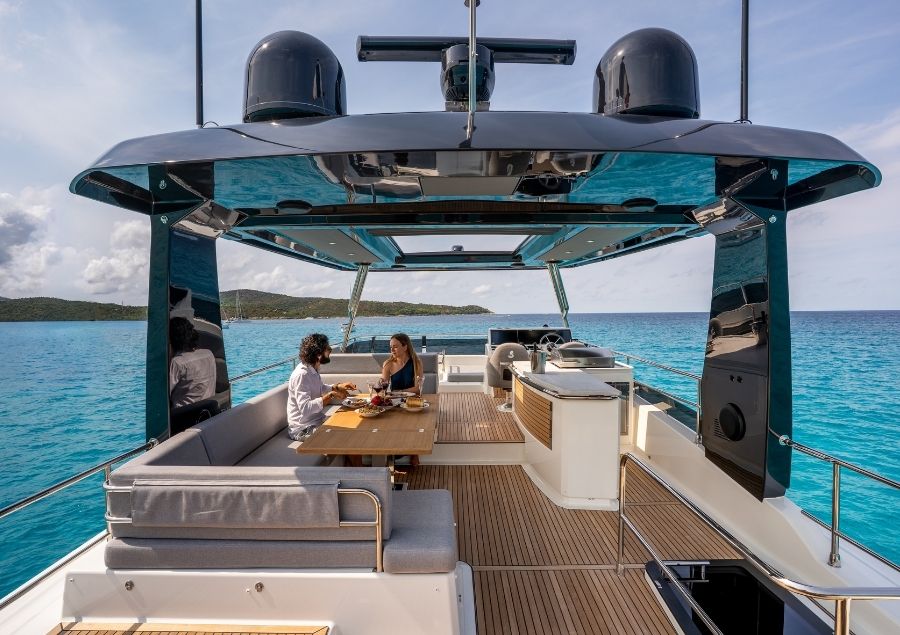 La postazione di comando recentemente riprogettata, che trae ispirazione dallo Swift Trawler 54, è dotata di schermi MFD galleggianti e di un passaggio al sistema di sterzo elettrico Xenta, offrendo un'esperienza di pilotaggio moderna, reattiva ed ergonomica.